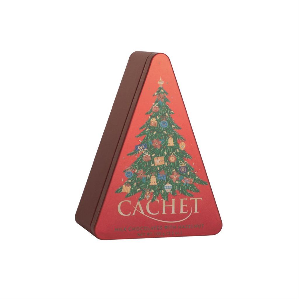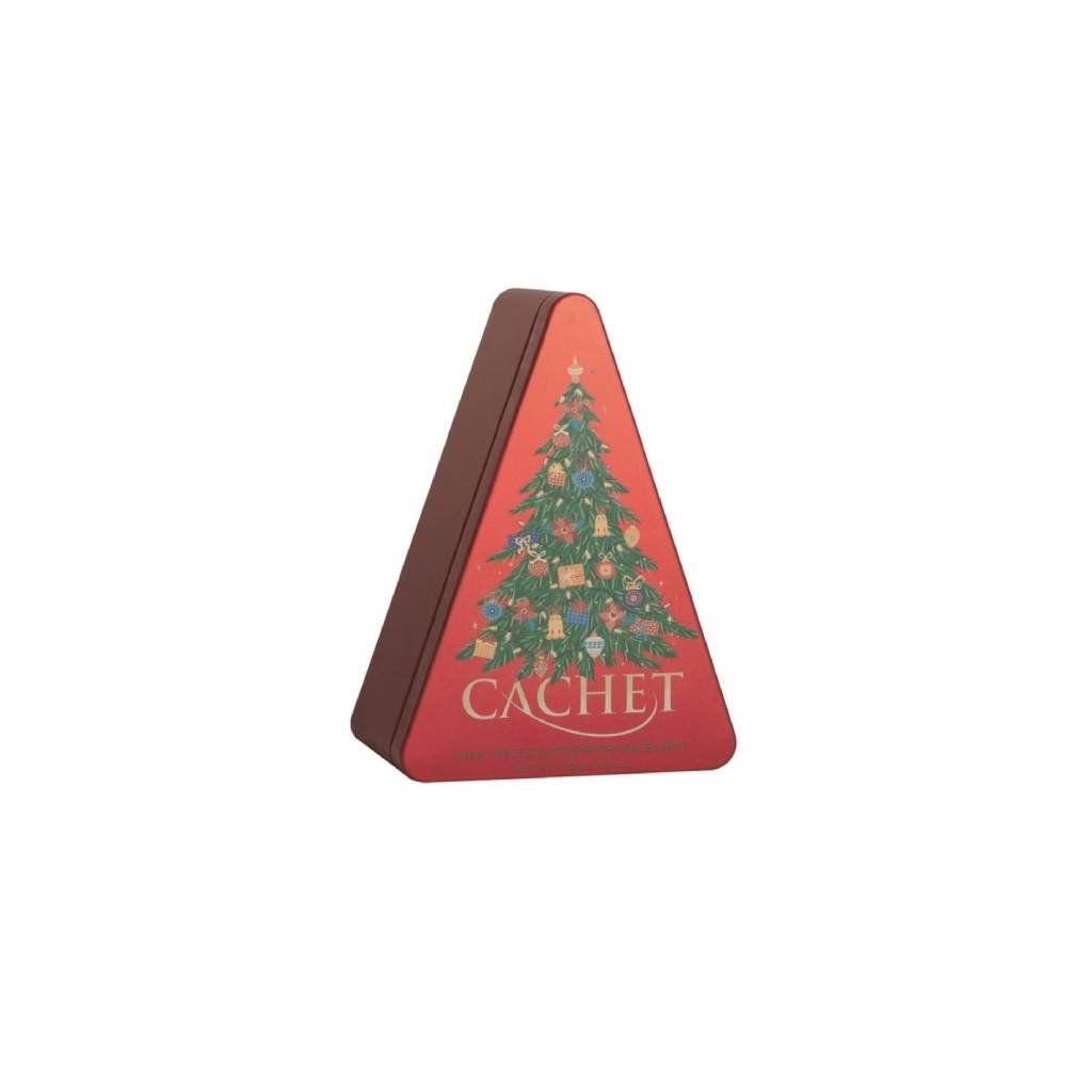 Belgická čokoláda Cachet Vánoční stromeček – mléčná s lískovými ořechy je balení 10 samostatně balených plátků belgické mléčné čokolády s kousky lískových ořechů v plechovém obalu ve formě vánočního stromečku. Produkt je uveden jako vyrobený v Kosher kvalitě.