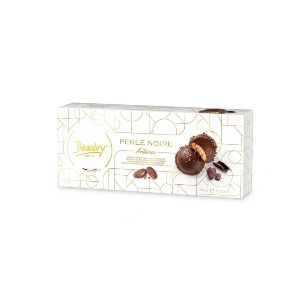 Belgické sušenky Desobry – Perly hořké jsou sušenky s jemnou náplní z hořké čokolády. Produkt je vyroben v Belgii a balení má hmotnost 100 g.