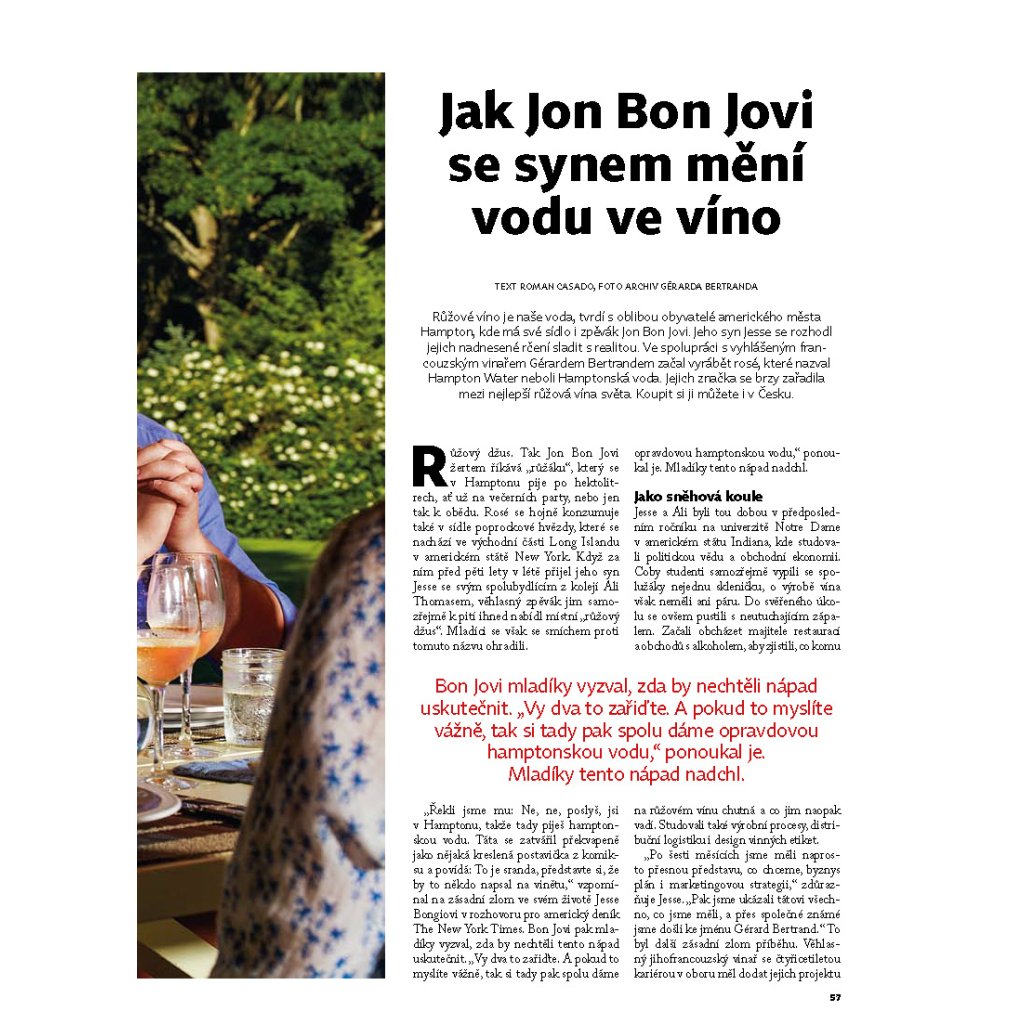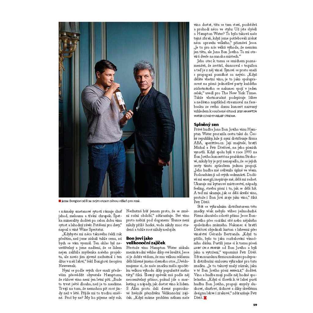 Ten Bon Joviho kluk je ale šikovnej. Udělal s tátou nejlepší rosé na světě pod taktovkou Gérarda Bertranda, nejlepšího francouzského vinaře roku 2020. Zdali je opravdu nejlepší, to nedokážeme posoudit, protože tolik rosé jsme ještě nevypili. Ovšem soudě podle toho, že teprve tímhle vínem jsme si u našich manželek vydobyli vážnost, která nám právem náleží, hovoří za mnohé. A teď si představte, jak na večírku pustíte třeba Blaze Of Glory (klidně z telefonu, jde o ten fór přece a ne nějaký hi-fi) a otevřete lahvinku Hampton Water.